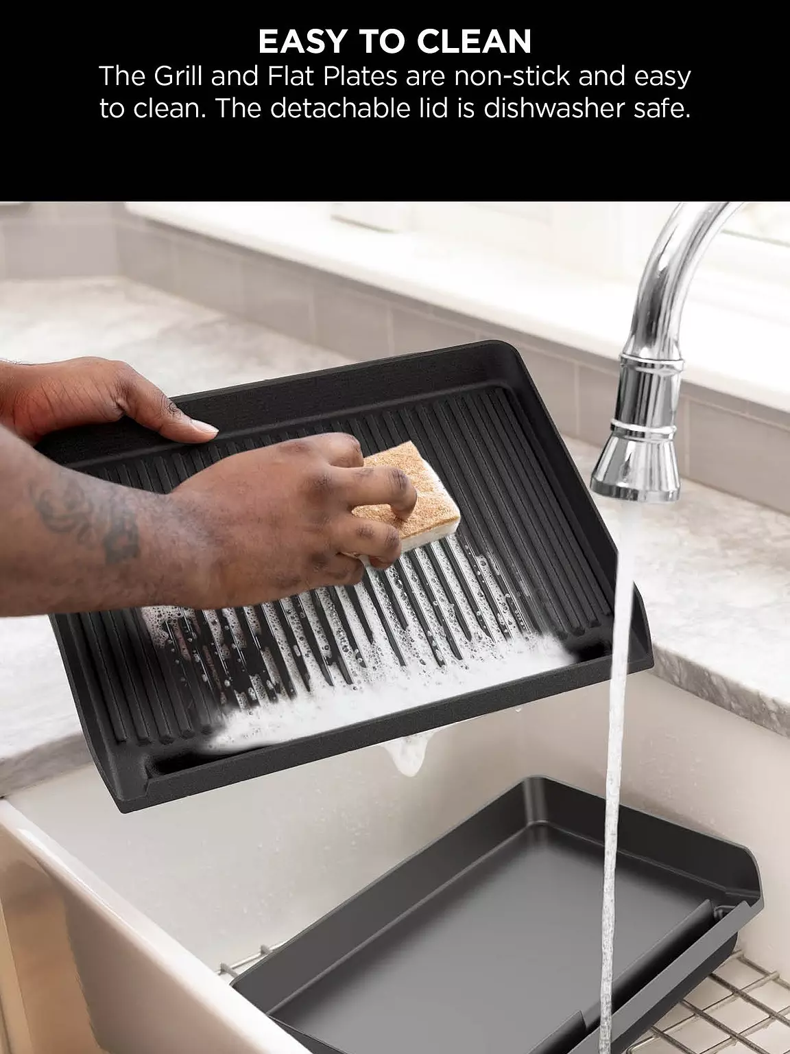 The detachable, dishwasher safe lid reduces smoke from your kitchen and helps to prevent splatter. The removable cooking plates are non-stick for easy cleaning. The grease catch keeps any grease run-off or cooking juices contained for mess-free cooking and easy cleaning.