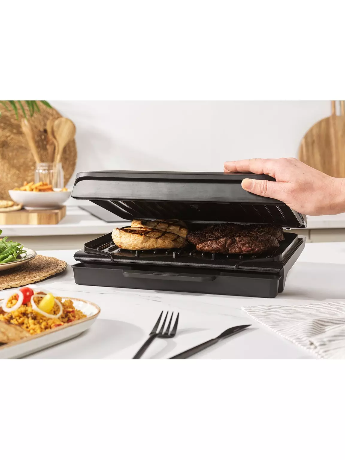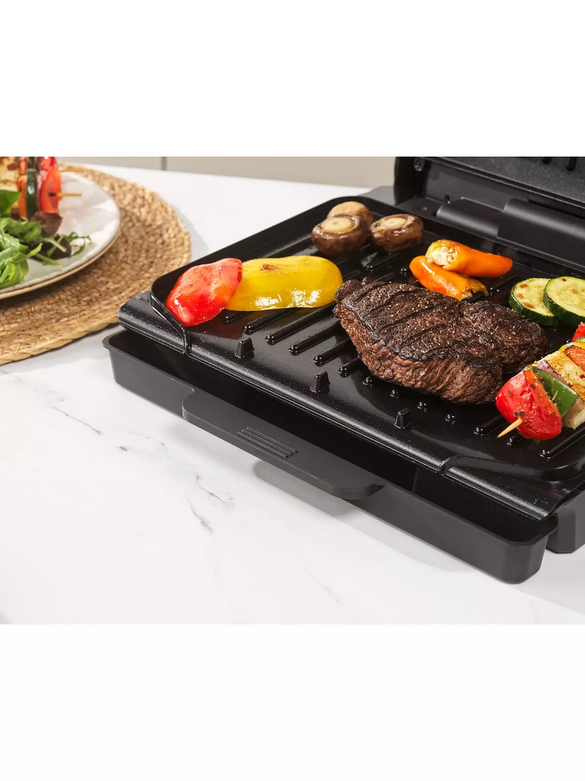 Featuring an innovative floating hinge system, you can grill juicy steaks or toast a deep fill panini! The hinge adjusts to accommodate thicker pieces of food, ensuring everything cooks evenly.