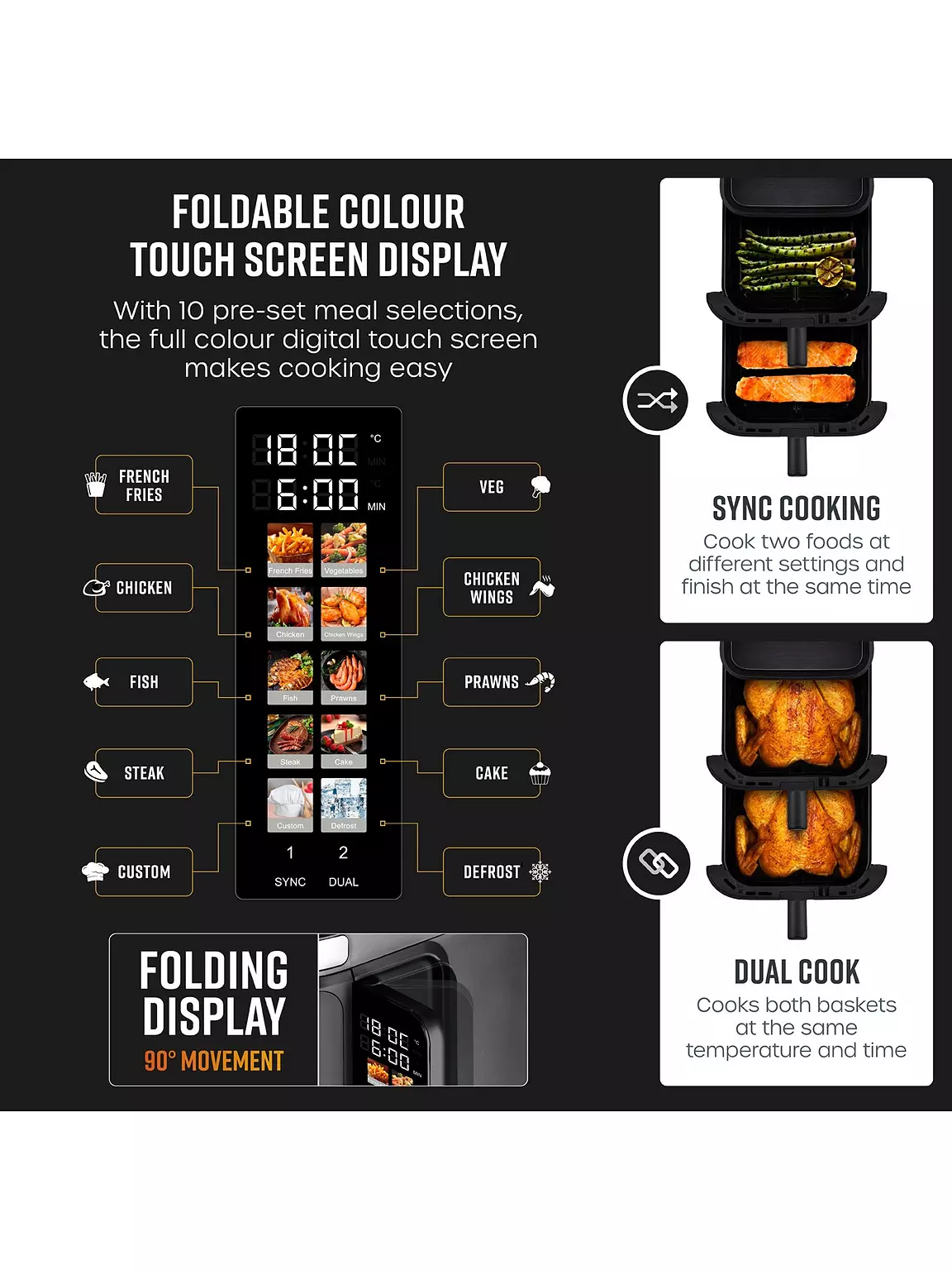 Complete with 10 pre-set meal selections, the full colour digital touch screen makes cooking easy. It even features a custom option for manually setting your own time and temperature. The toughened glass viewing windows on each basket means the cooking progress can be constantly monitored for ultimate peace of mind.